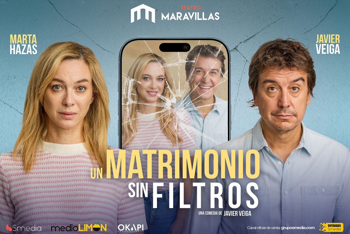 Un matrimonio sin filtros, con Marta Hazas y Javier Veiga, una comedia escrita por Javier Veiga sobre el fin del amor en la pareja, sobre la adicción al teléfono móvil, y sobre la correlación entre ambas cuestiones (si la hubiere) … Un reality-show en el que los espectadores van a poder asistir en directo a todas esas miserias que las parejas suelen mostrar sólo de puertas para adentro.